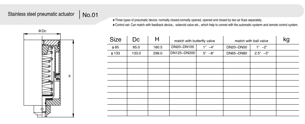 A: Pagrindiniai tipai yra vienpusio ir dvigubo veikimo pneumatinės pavaros, parenkamos atsižvelgiant į saugos reikalavimus ir darbo sąlygų veikimo dažnumą: ① Dvigubo veikimo pavara: Varomas dviejų oro šaltinių, vožtuvas stabiliai atsidaro ir užsidaro greitai reaguojant, tinka įprastoms sanitarinėms darbo sąlygoms su automatinėmis gamybos linijomis ir aukšto dažnio išjungimo šaltiniu valdymu; ② Vieno veikimo pavara: su spyruoklinės grąžinimo konstrukcija, varoma oro įsiurbimo anga vienoje pusėje ir automatiškai atstatoma (atidaroma / uždaroma) po oro praradimo, ji pasižymi aukštu saugos ir apsaugos efektyvumu, tinka didelės rizikos sanitarinėms darbo sąlygoms, kai terpė yra degi, toksiška ir ėsdinanti, ir gali veiksmingai išvengti vamzdyno saugos pavojaus sugedus oro šaltiniui.